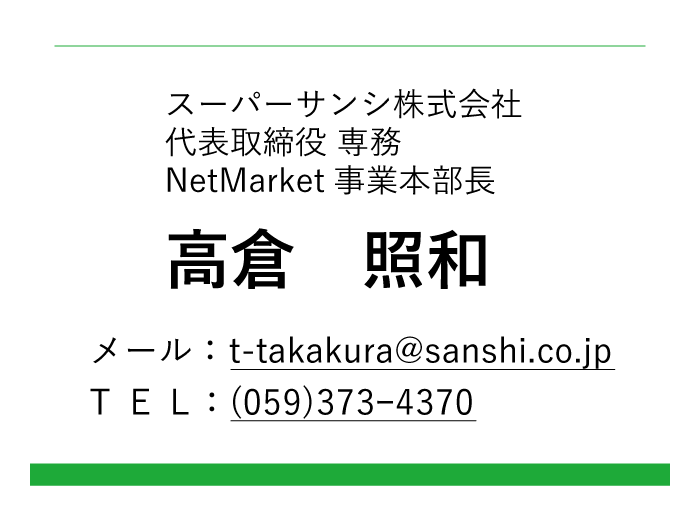 私どもは、40年以上に亘って、宅配&ネットスーパーを手掛けて参りましたが、今まさにSM業界にとっての大変化&チャンスを目の当たりにしております。生鮮食品のネット宅配は以前より毎年店舗をはるかに越える勢いで順調に伸びてきておりましたが、このコロナの影響で、その流れがさらに一気に加速し、方向が確定しました。そして驚くべきことにコロナ後も更に勢いを増して売上が伸長し続けております。